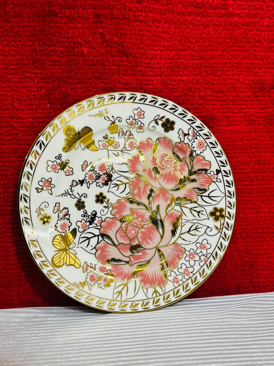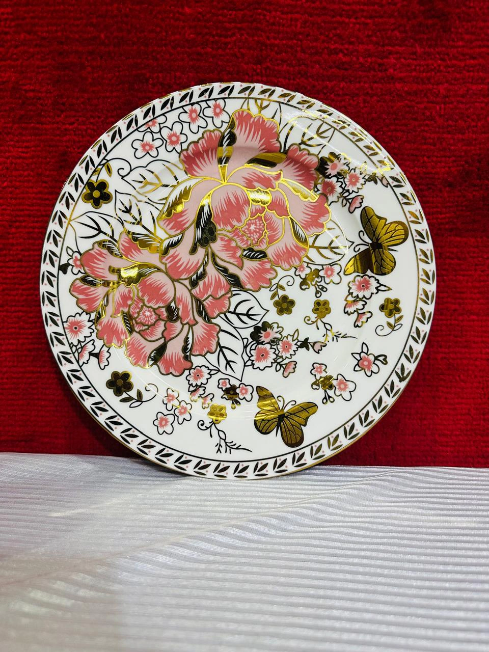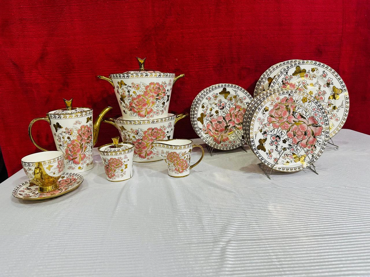 Buy the Royal Bone China 61-Piece Floral Dinner Set with golden butterfly design. Perfect luxury dinnerware for weddings, jahez, and family dining. Elegant, durable & timeless.