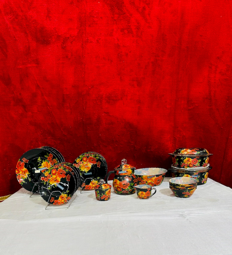 Upgrade your dining experience with this luxury black floral dinnerware and tea set. Featuring beautifully detailed plates, bowls, cups, and a matching teapot, this set blends bold elegance with vibrant floral design. Ideal for family meals, festive occasions, or formal gatherings, it brings sophistication to any table setting. Crafted with durability and fine artistry, this set is also a perfect gift choice for weddings, anniversaries, or housewarmings. Add a touch of class and charm to your serveware collection with this stunning black floral dinnerware set.