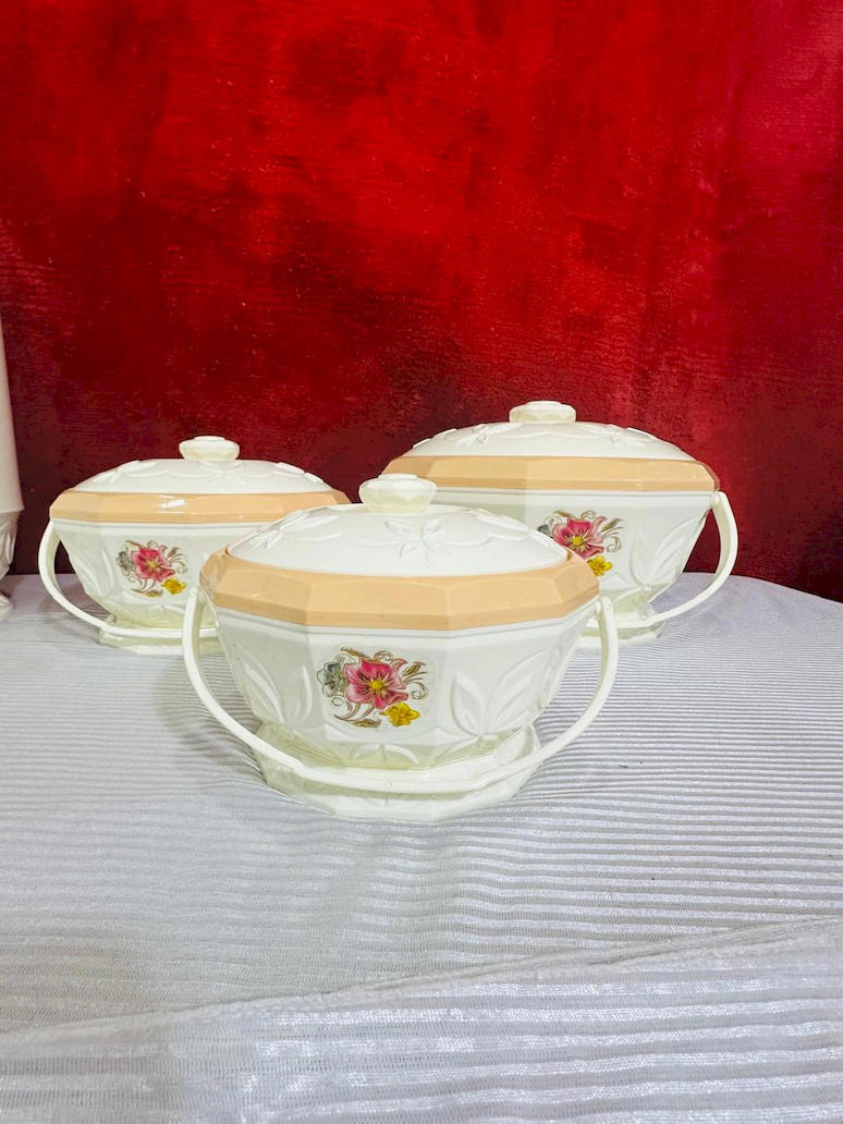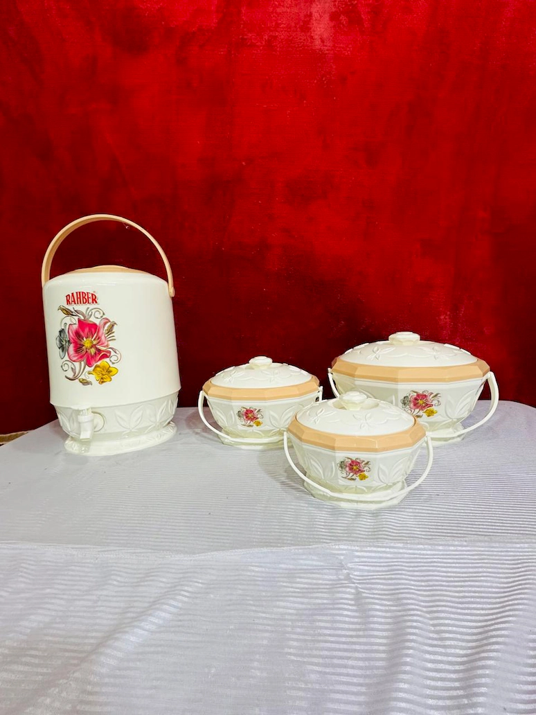 Upgrade your kitchen with the Rahber Hotpot & Water Cooler Set, a perfect blend of style, durability, and performance. Designed with elegant floral patterns and a smooth ivory finish, this set adds beauty to your dining table while keeping your meals fresh and warm.
